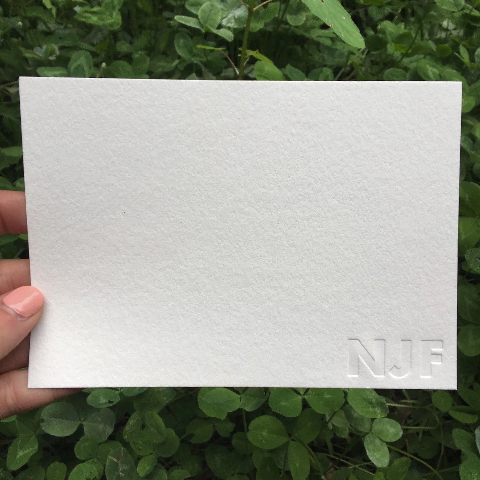 CUSTOM LETTERPRESS STATIONERY with three letters of your choice. The font is a modern classic, "Futura." The letters are bold and in the bottom right corner. We recommend doing a "blind" run for this option -- no ink is added to the press - you just see the impression of the letters. Colors are available, however, if that is what you prefer.