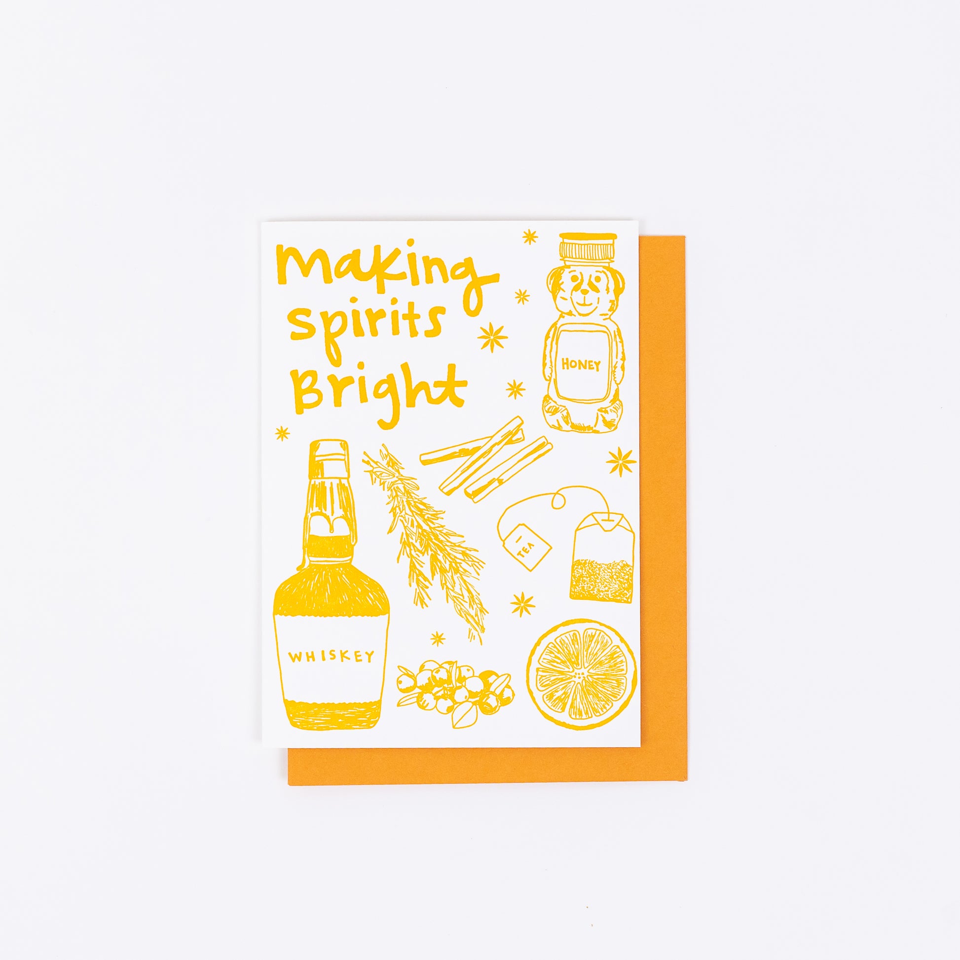 This is a sweet holiday card with the words "Making Spirits Bright" and hand-drawn illustrations in bright golden yellow ink.