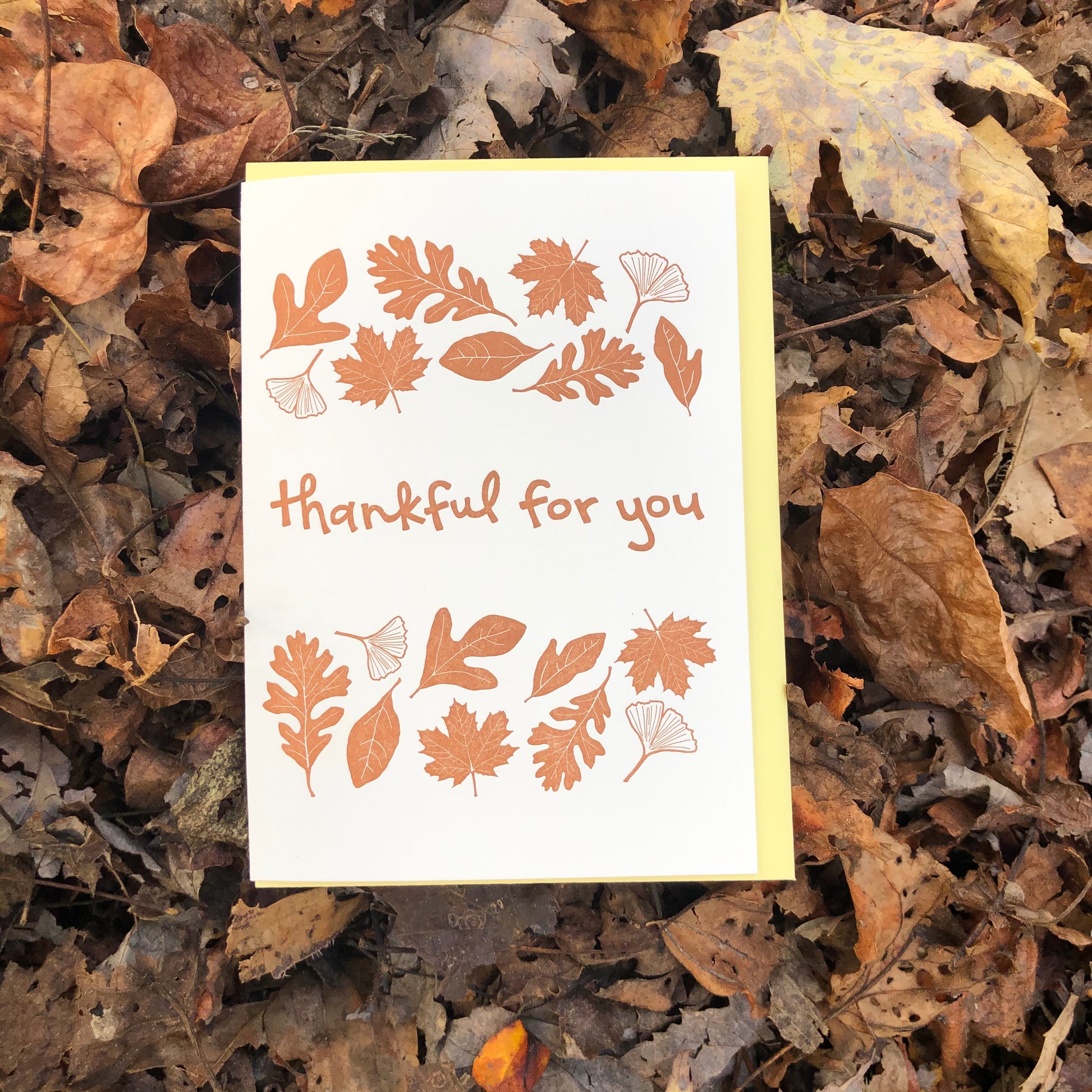 Show your appreciation with this unique, letterpressed greeting card. Featuring hand-drawn autumn leaves and the phrase "Thankful for You," this card is perfect for sending fall season's greetings or expressing gratitude to family or friends. The perfect way to spread the Thanksgiving spirit!